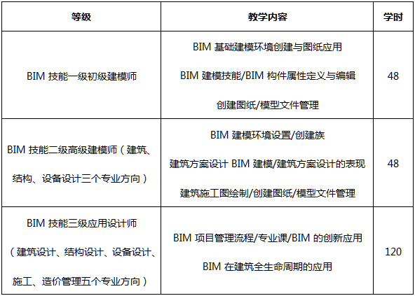 本技能共设三个等级,一级为 BIM初级建模师;二级为BIM高级建模师(分为三个专业方向);三级为BIM应用设计师(分为五个专业方向)。凡通过一级考评者,获得BIM初级建模师证书;通过二级考评者,获得BIM高级建模师证书;通过三级考评者,获得BIM应用设计师证书。